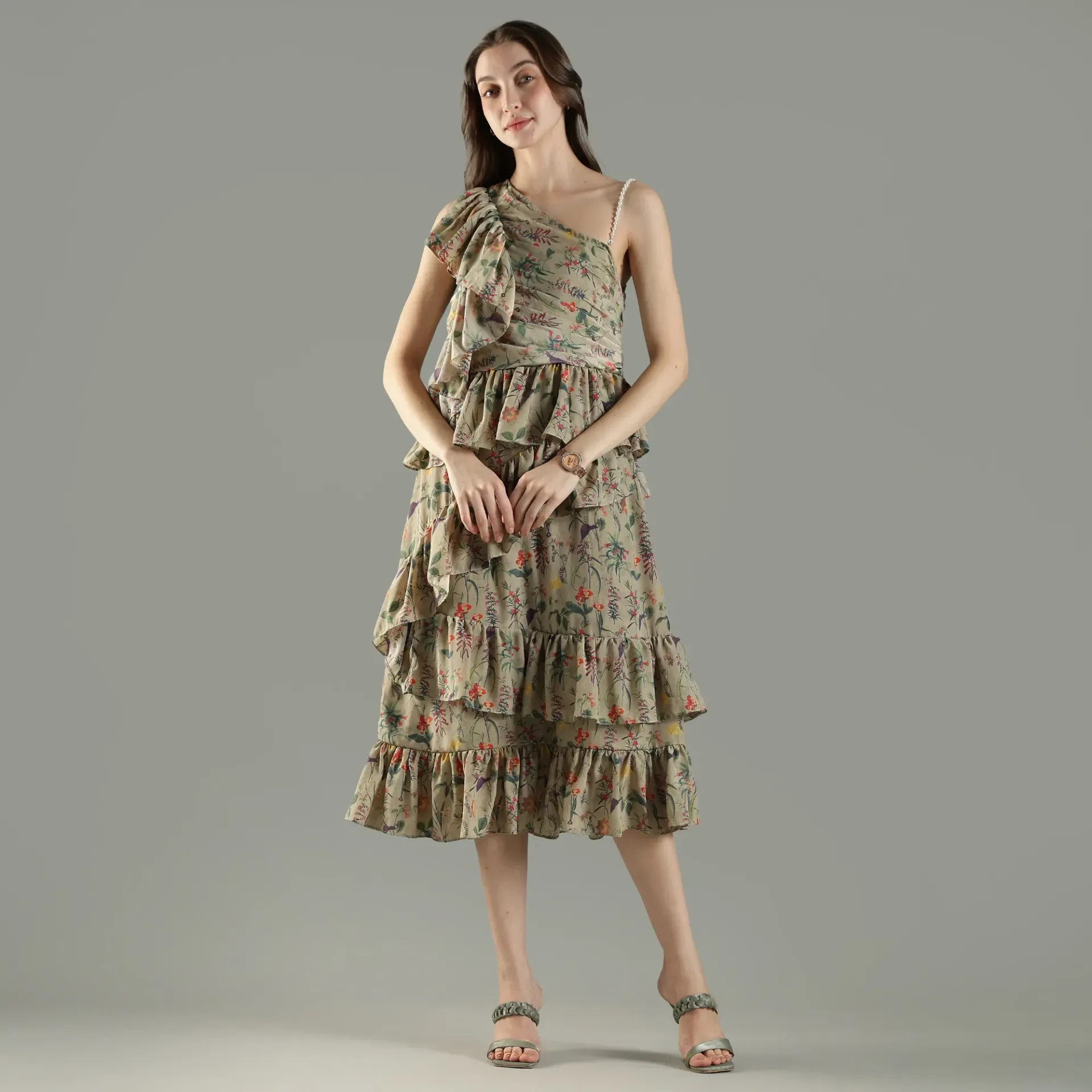 The dress showcases delicate ruffled shoulder straps, a structured square neckline, and a flattering fitted bodice that flows into a softly flared midi dress. The placement print enhances the silhouette, creating a balanced and sophisticated finish perfect for elevated daywear, vacations, and special occasions.